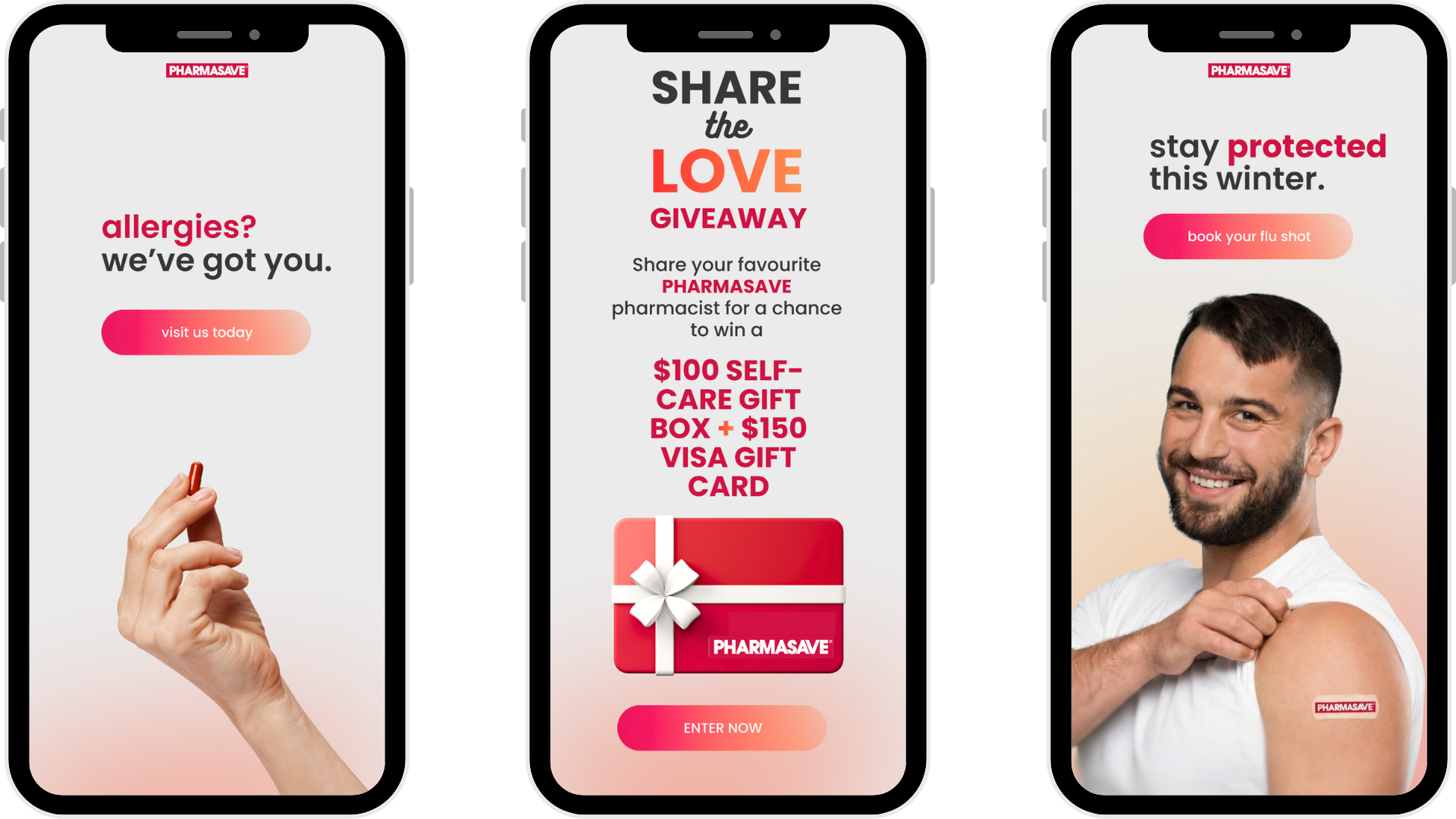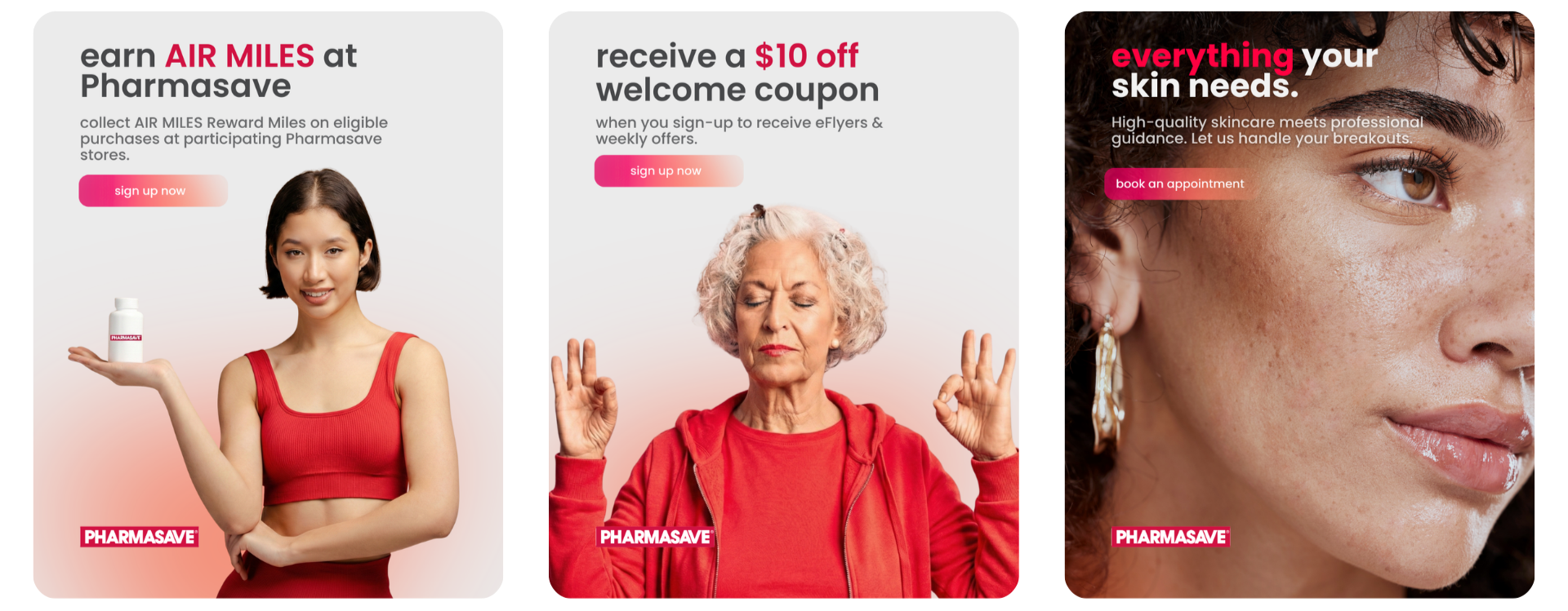 I prioritized only working within the brands two established colours, red and light grey, and avoiding the busy, outdated visuals that have defined Pharmasave promotion in the digital age. Soft gradients, dynamic buttons, and minimalist layouts ensured that this take on the brand felt new and different, built for digital. I mixed their existing base of stock imagery with my own photography from the Pharmasave Sunridge location, editing every visual diligently to ensure cohesion and that all promotion was true to them and their customers.