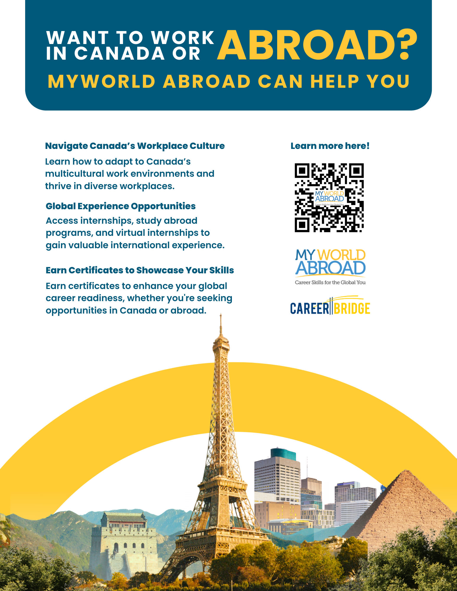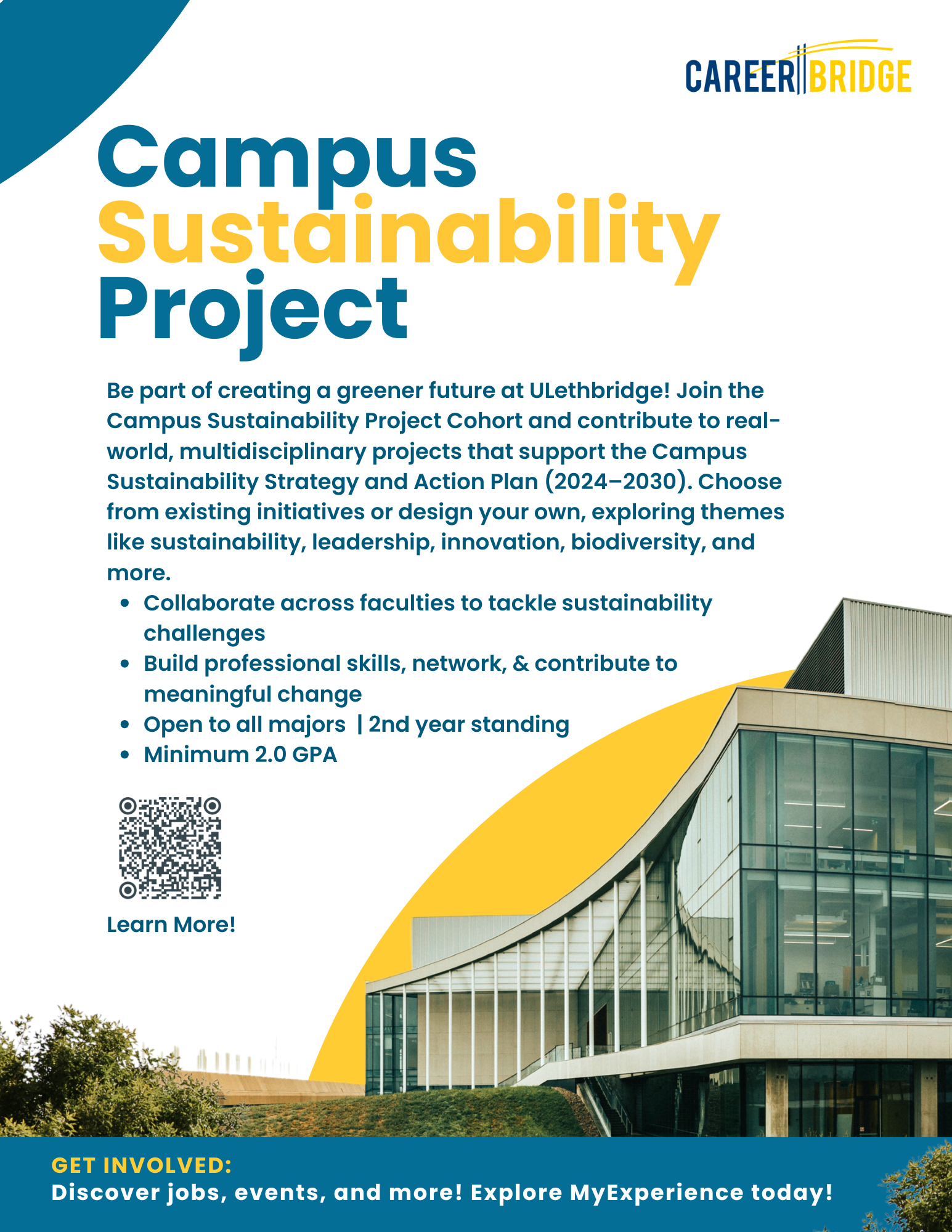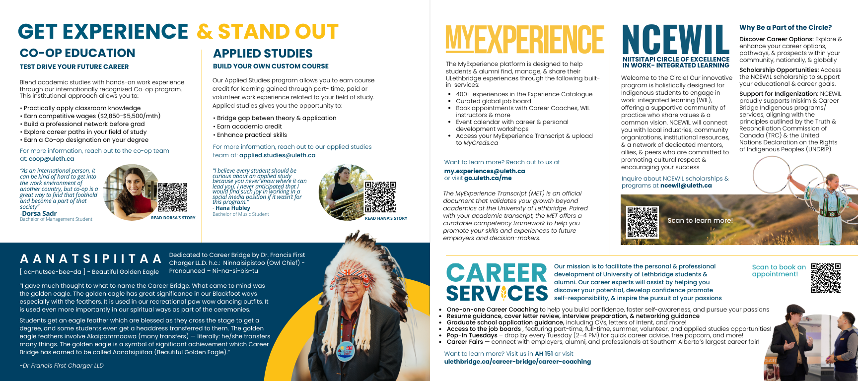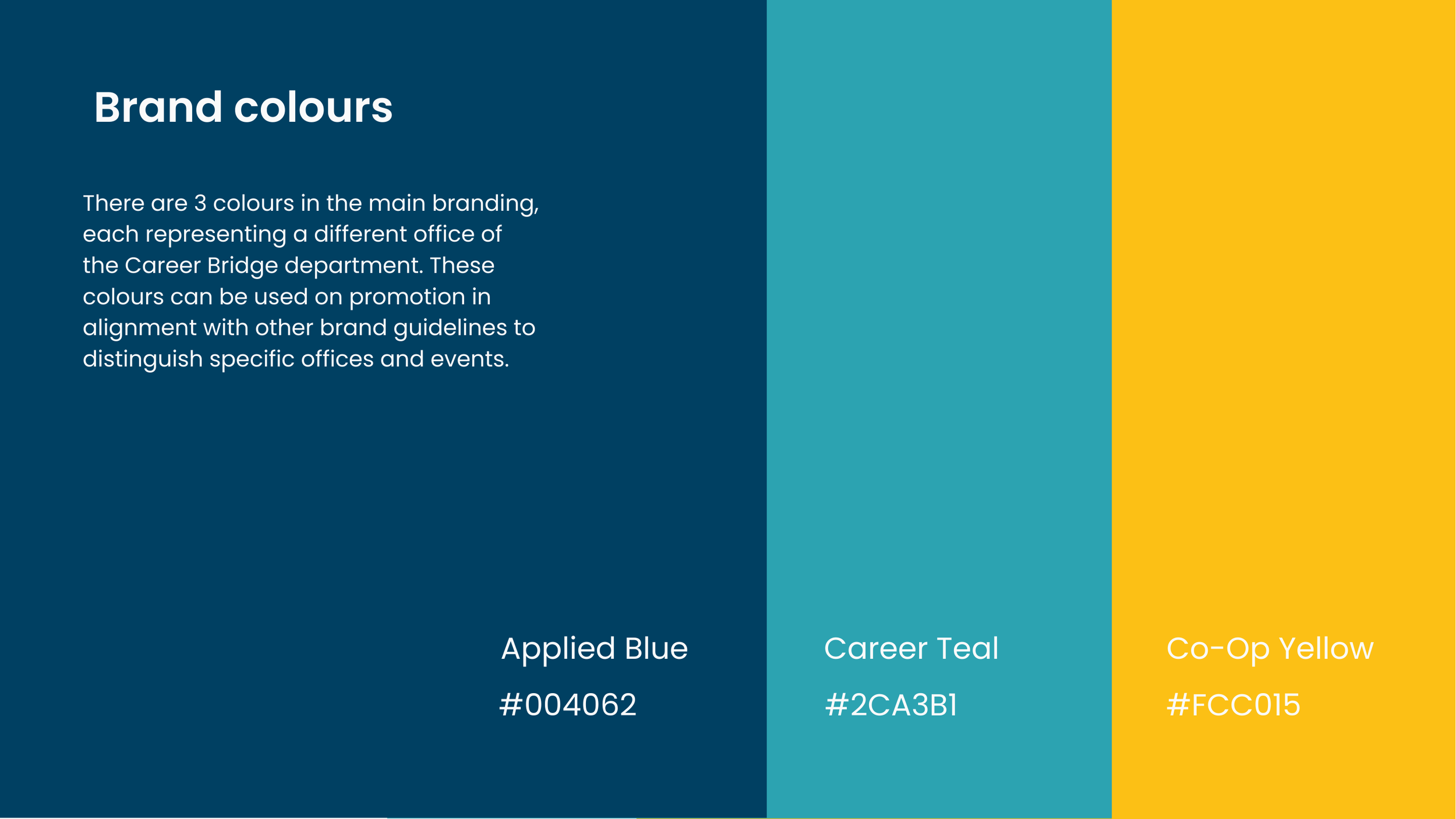 Creating the branding for Career Bridge focused on visually representing connection, growth, and progression within the university’s career department. The core visual element is an arch shape symbolizing the bridge itself, expanded into three distinct arches in different colours to represent the three offices and phases of Career Bridge: Applied Studies, Co-op, and Career Services. This structure reflects the student journey, from exploration to experience to career readiness, while maintaining a cohesive system across all touchpoints. The branding also incorporates the gifted Blackfoot name for the department, meaning Beautiful Golden Eagle, as a subtitle included on all promotional materials, grounding the identity in cultural significance, respect, and a sense of aspiration and forward movement.